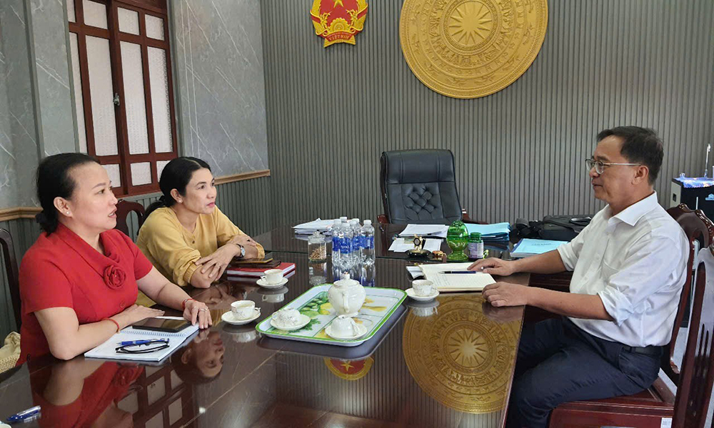 Phó Giám đốc Thái Thị Kim Thủy (áo đỏ), trao đổi với ông Trần Tam Trung- Chủ tịch UBND phường Giá Rai