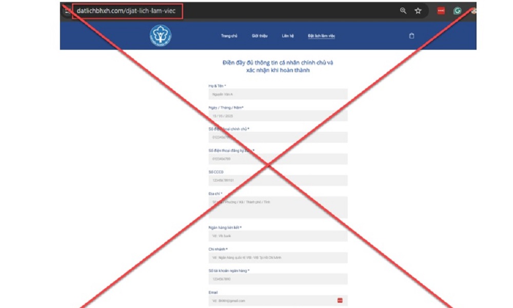 Qua công tác giám sát trên không gian mạng, Trung tâm Công nghệ thông tin và Chuyển đổi số phát hiện website giả mạo có địa chỉ datlichbhxh[.]com có thể được sử dụng để thực hiện các hành vi giả mạo cán bộ BHXH, gửi đường dẫn của website yêu cầu cung cấp các thông tin cá nhân như căn cước công dân, số tài khoản ngân hàng, thẻ BHYT… nhằm lừa đảo, đánh cắp thông tin, chiếm đoạt tài sản.