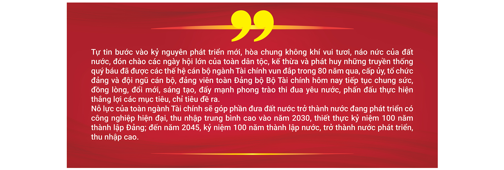 Tự tin bước vào kỷ nguyên phát triển mới, hòa chung không khí vui tươi, náo nức của đất nước, đón chào các ngày hội lớn của toàn dân tộc, kế thừa và phát huy những truyền thống quý báu đã được các thế hệ cán bộ ngành Tài chính vun đắp trong 80 năm qua, cấp ủy, tổ chức đảng và đội ngũ cán bộ, đảng viên toàn Đảng bộ Bộ Tài chính hôm nay tiếp tục chung sức, đồng lòng, đổi mới, sáng tạo, đẩy mạnh phong trào thi đua yêu nước, phấn đấu thực hiện thắng lợi các mục tiêu, chỉ tiêu đề ra.