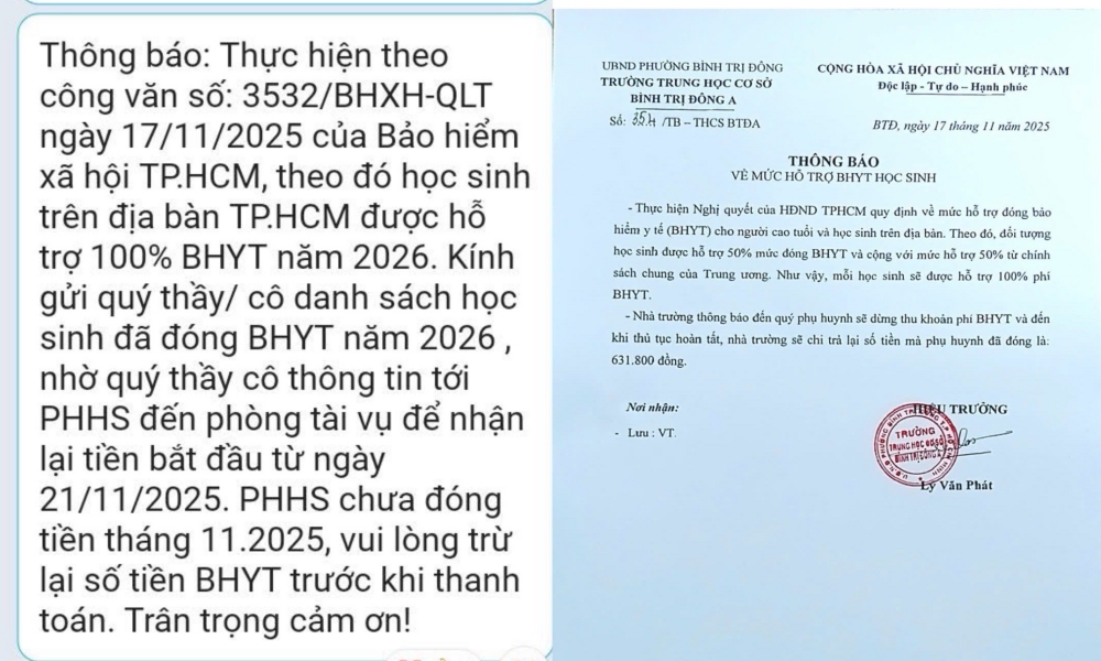 Tại nhiều trường học ở TP. Hồ Chí Minh, khi tiếp nhận thông tin về chính sách hỗ trợ BHYT đối với học sinh, các trường đã chủ động thông báo đến phụ huynh. Theo đó, thông báo đối với các trường hợp đã đóng BHYT năm 2026, nhà trường sẽ lập danh sách hoàn trả; với những trường hợp chưa đóng thì không cần đóng nữa…