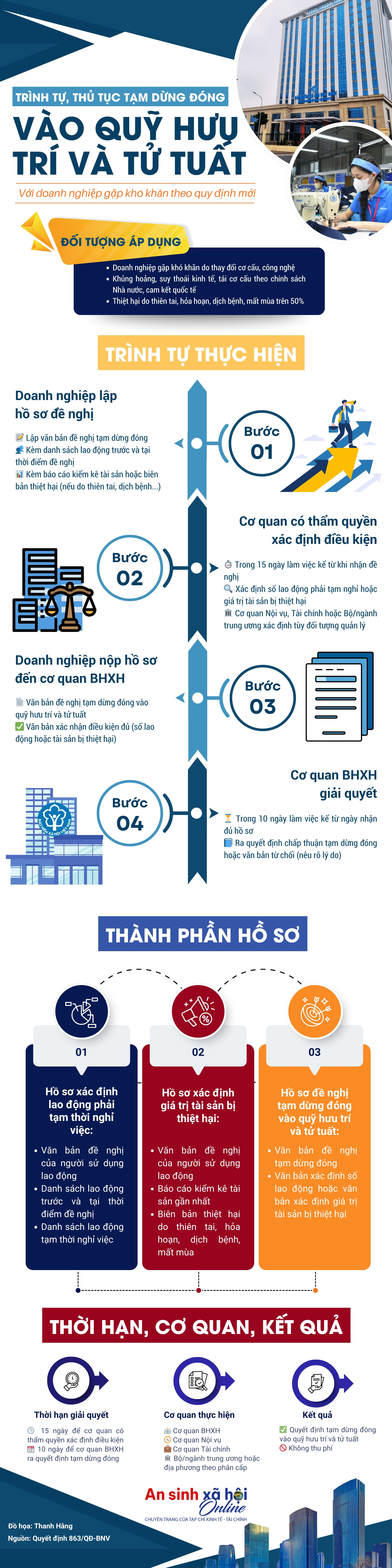 Theo Quyết định số 863/QĐ-BNV của Bộ Nội vụ, có hiệu lực từ ngày 1/7/2025, trong một số trường hợp đặc biệt như thay đổi cơ cấu, khủng hoảng, suy thoái kinh tế hoặc thiên tai… người sử dụng lao động có thể đề nghị cơ quan BHXH cho tạm dừng đóng vào quỹ hưu trí và tử tuất.