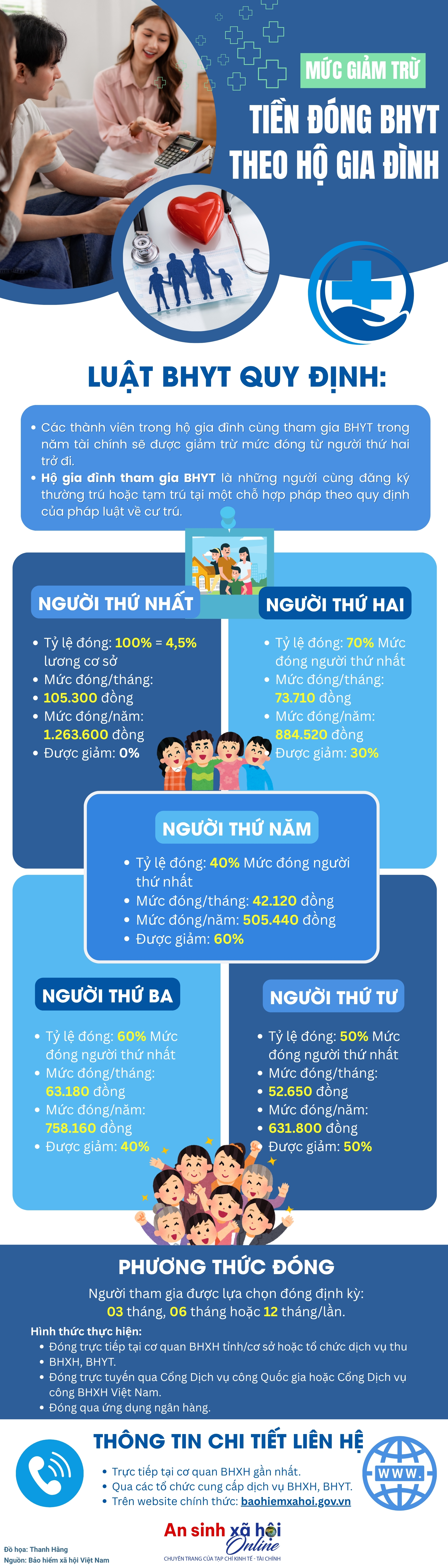 Theo quy định của Luật Bảo hiểm y tế (BHYT) sửa đổi, bổ sung có hiệu lực từ 1/7/2025, khi đóng BHYT hộ gia đình, các thành viên cùng tham gia sẽ được giảm trừ theo số người tham gia.