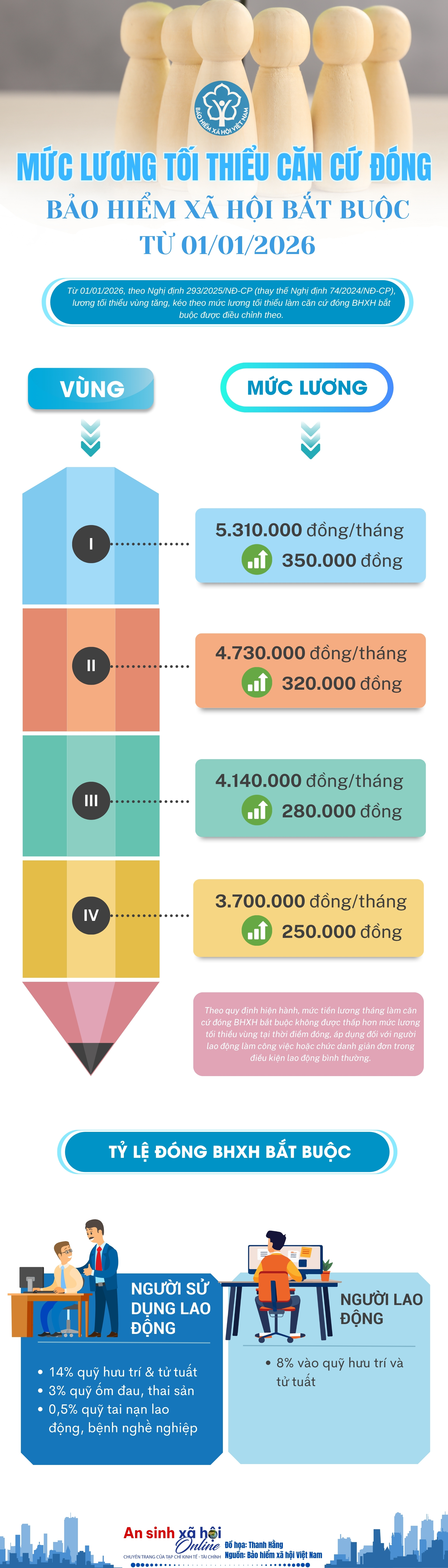 Từ ngày 1/1/2026, lương tối thiểu vùng tăng, theo đó mức lương tối thiểu làm căn cứ tính tỷ lệ đóng BHXH bắt buộc cũng có sự điều chỉnh.