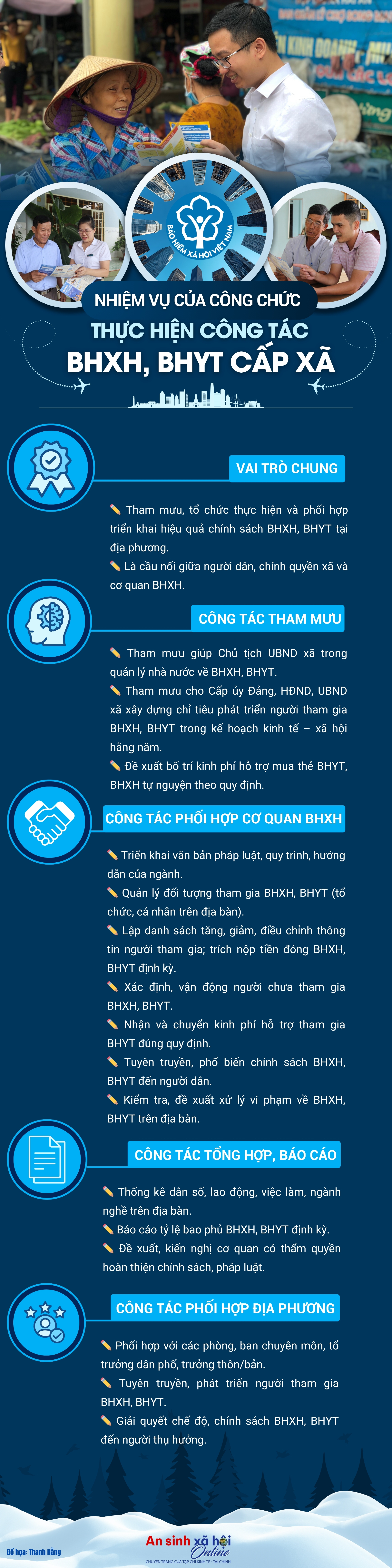 Nhiệm vụ của công chức phụ trách công tác BHXH, BHYT cấp xã gồm tham mưu, tổ chức thực hiện và phối hợp với các bộ phận liên quan để triển khai hiệu quả các chính sách BHXH, BHYT tại địa phương.
