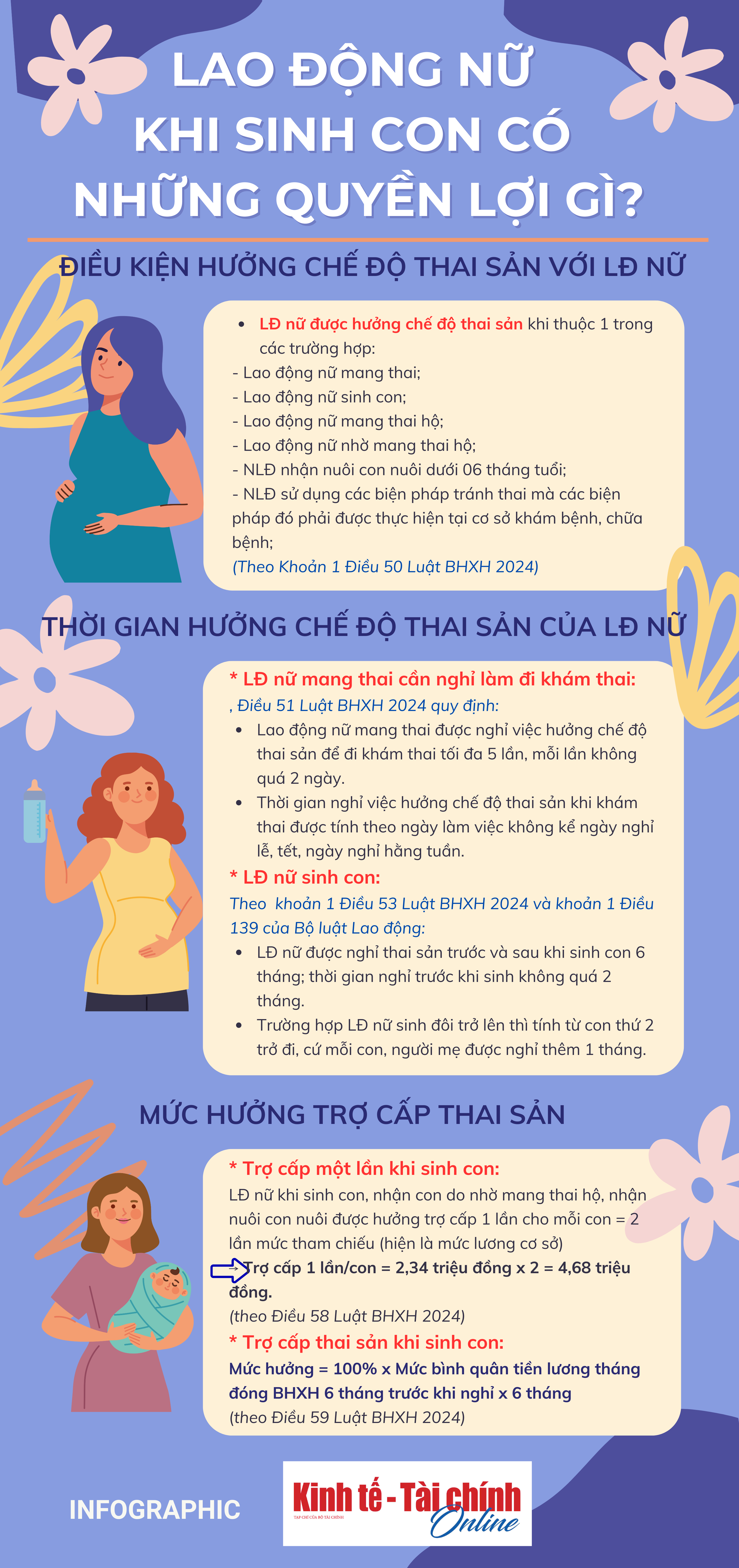 Luật Bảo hiểm xã hội năm 2024 có hiệu lực từ ngày 1/7/2025 đã có những quy định cụ thể về quyền lợi của lao động nữ khi sinh con.