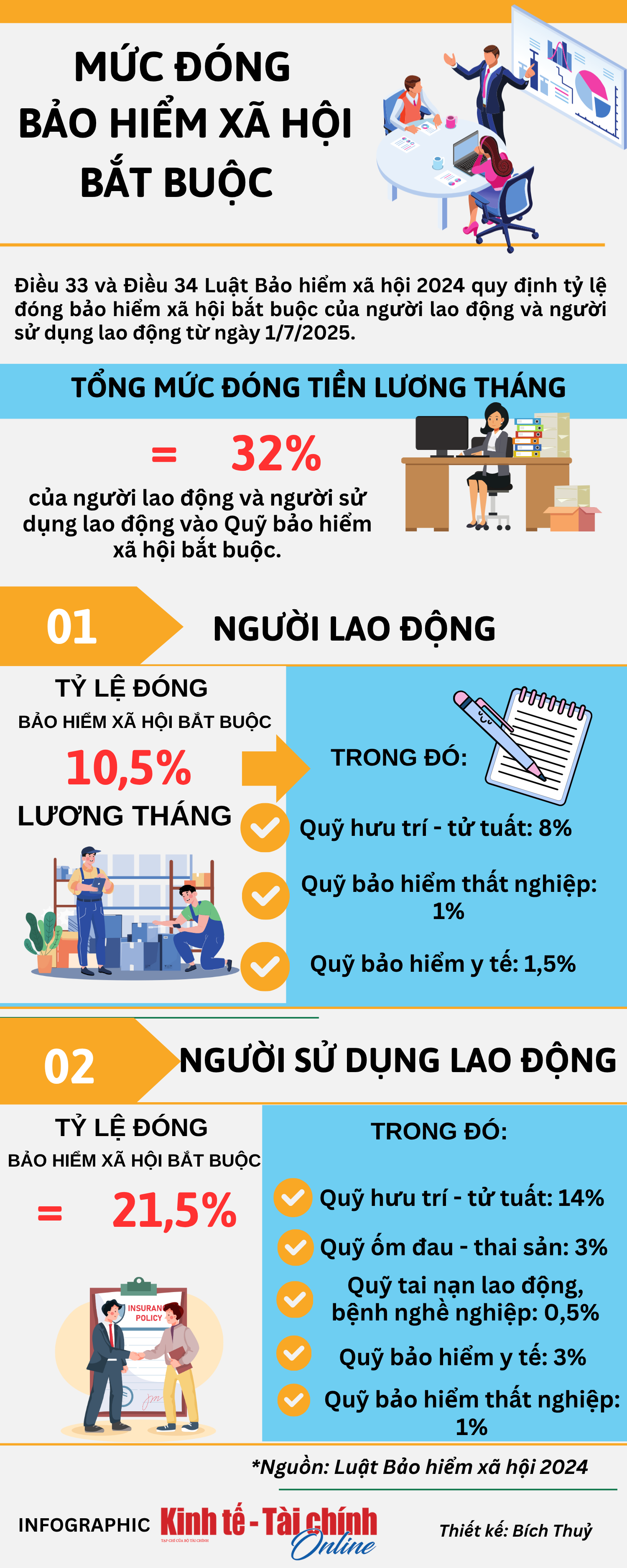 Điều 33 và Điều 34 Luật Bảo hiểm xã hội 2024 quy định tỷ lệ đóng bảo hiểm xã hội bắt buộc của người lao động và người sử dụng lao động từ ngày 1/7/2025.