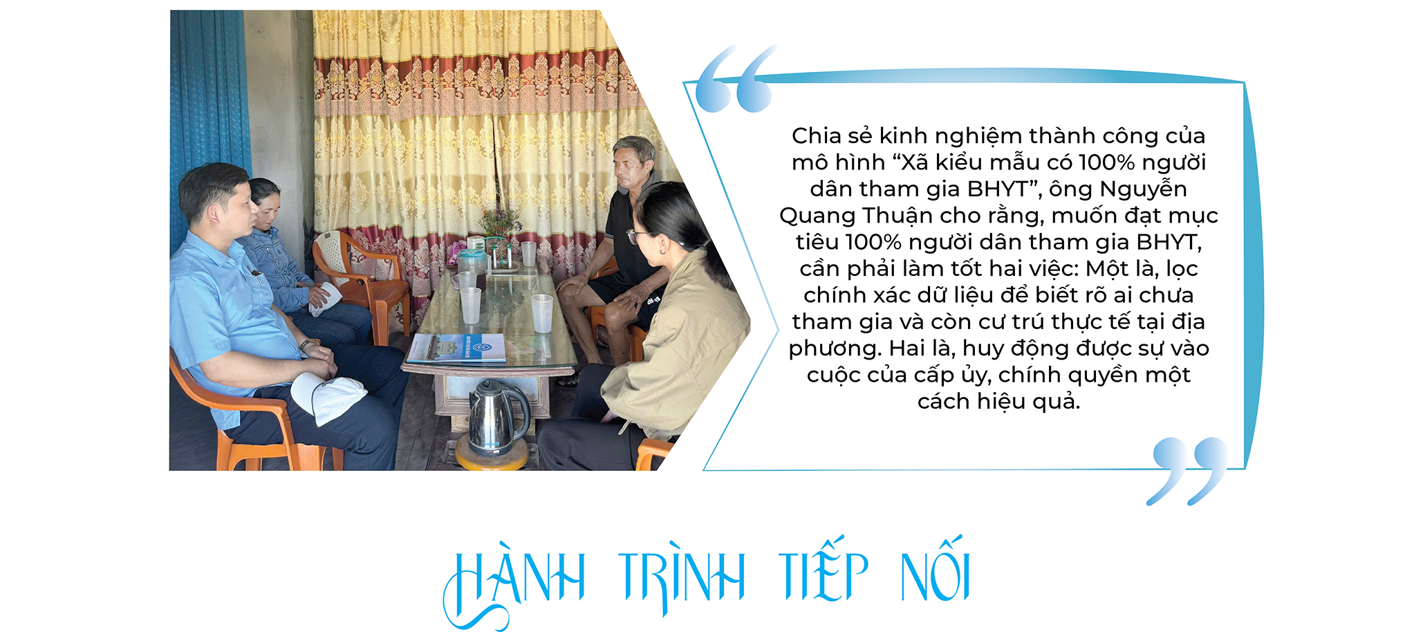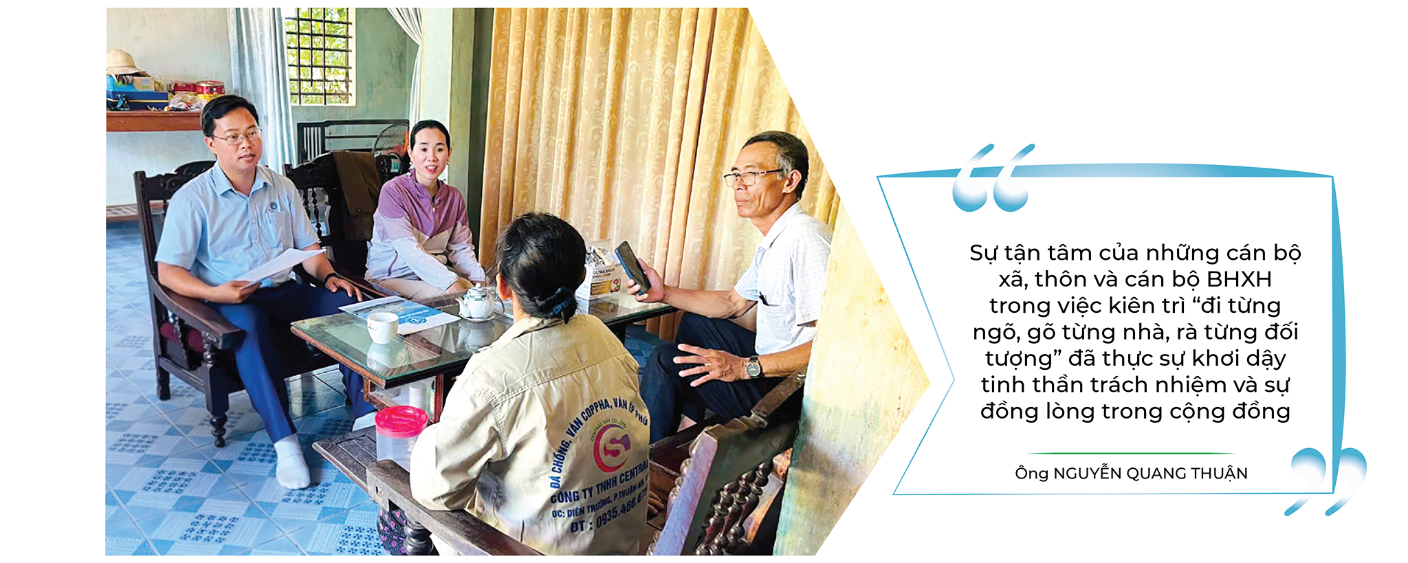 Đặc biệt, dưới sự chỉ đạo của UBND huyện, sự chủ động tham mưu và điều phối của ông Nguyễn Quang Thuận, mô hình đã huy động được toàn hệ thống chính trị vào cuộc. Sự tận tâm của những cán bộ xã, thôn và cán bộ BHXH trong việc kiên trì “đi từng ngõ, gõ từng nhà, rà từng đối tượng” đã thực sự khơi dậy tinh thần trách nhiệm và sự đồng lòng trong cộng đồng.
