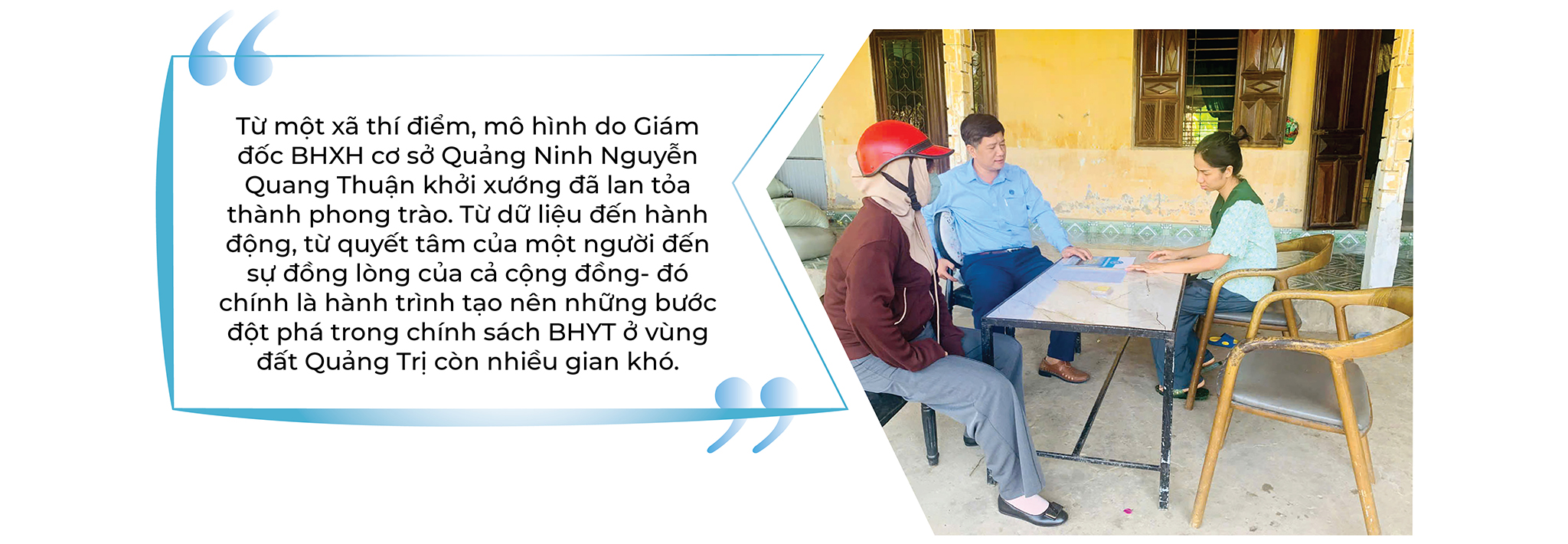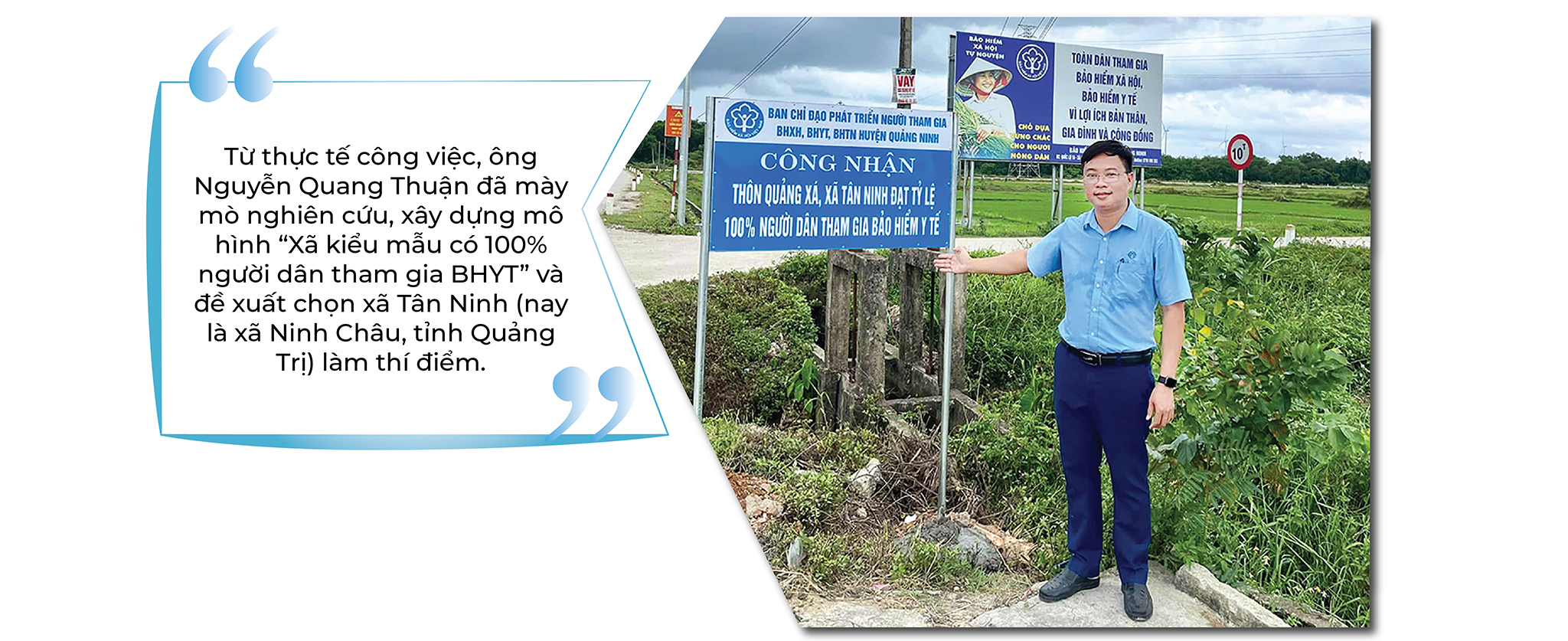 Chính sách BHYT có ý nghĩa nhân văn, không chỉ là “lá chắn” hiệu quả, giúp người dân được bảo vệ khi ốm đau, bệnh tật, nhất là giảm gánh nặng tài chính cho gia đình, mà còn lan tỏa tinh thần trách nhiệm vì cộng đồng. Từ thực tế công việc, ông Nguyễn Quang Thuận đã mày mò nghiên cứu, xây dựng mô hình “Xã kiểu mẫu có 100% người dân tham gia BHYT” và đề xuất chọn xã Tân Ninh (nay là xã Ninh Châu, tỉnh Quảng Trị) làm thí điểm.