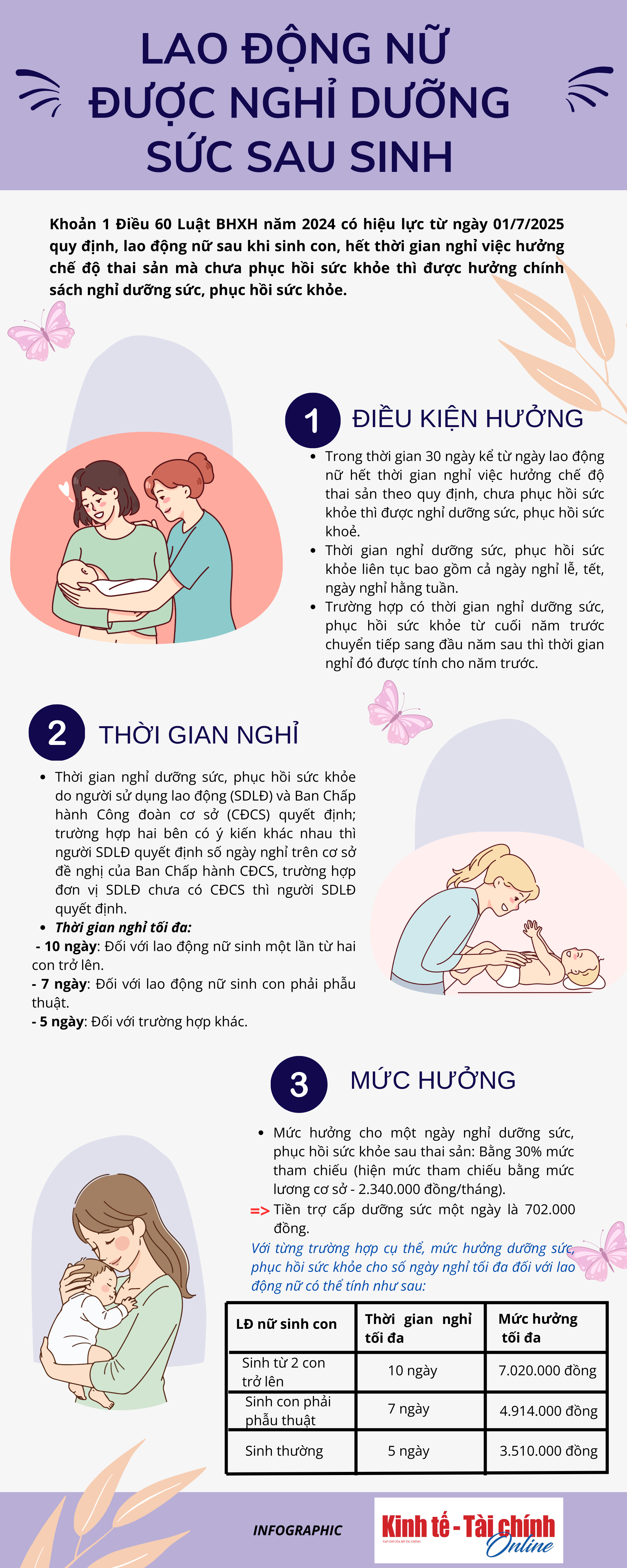 Lao động nữ sau khi sinh con, hết thời gian nghỉ việc hưởng chế độ thai sản mà chưa phục hồi sức khỏe thì được hưởng chính sách nghỉ dưỡng sức, phục hồi sức khỏe.