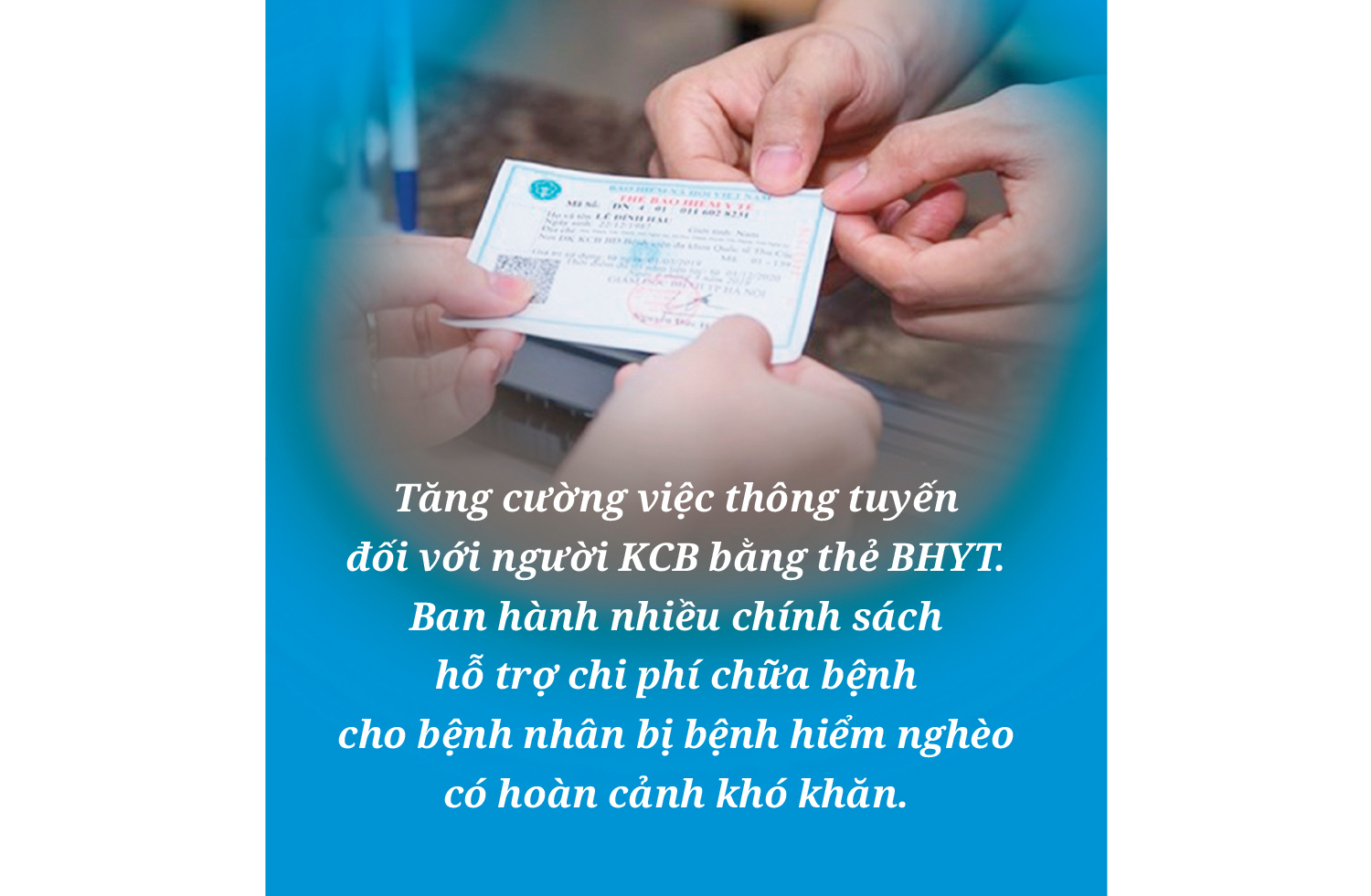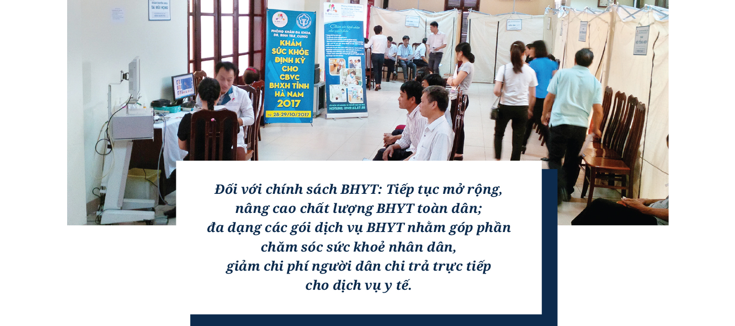 Tăng cường việc thông tuyến đối với người KCB bằng thẻ BHYT. Ban hành nhiều chính sách hỗ trợ chi phí chữa bệnh cho bệnh nhân bị bệnh hiểm nghèo có hoàn cảnh khó khăn (thuộc hộ nghèo, hộ cận nghèo, hộ gia đình neo đơn đặc biệt khó khăn).