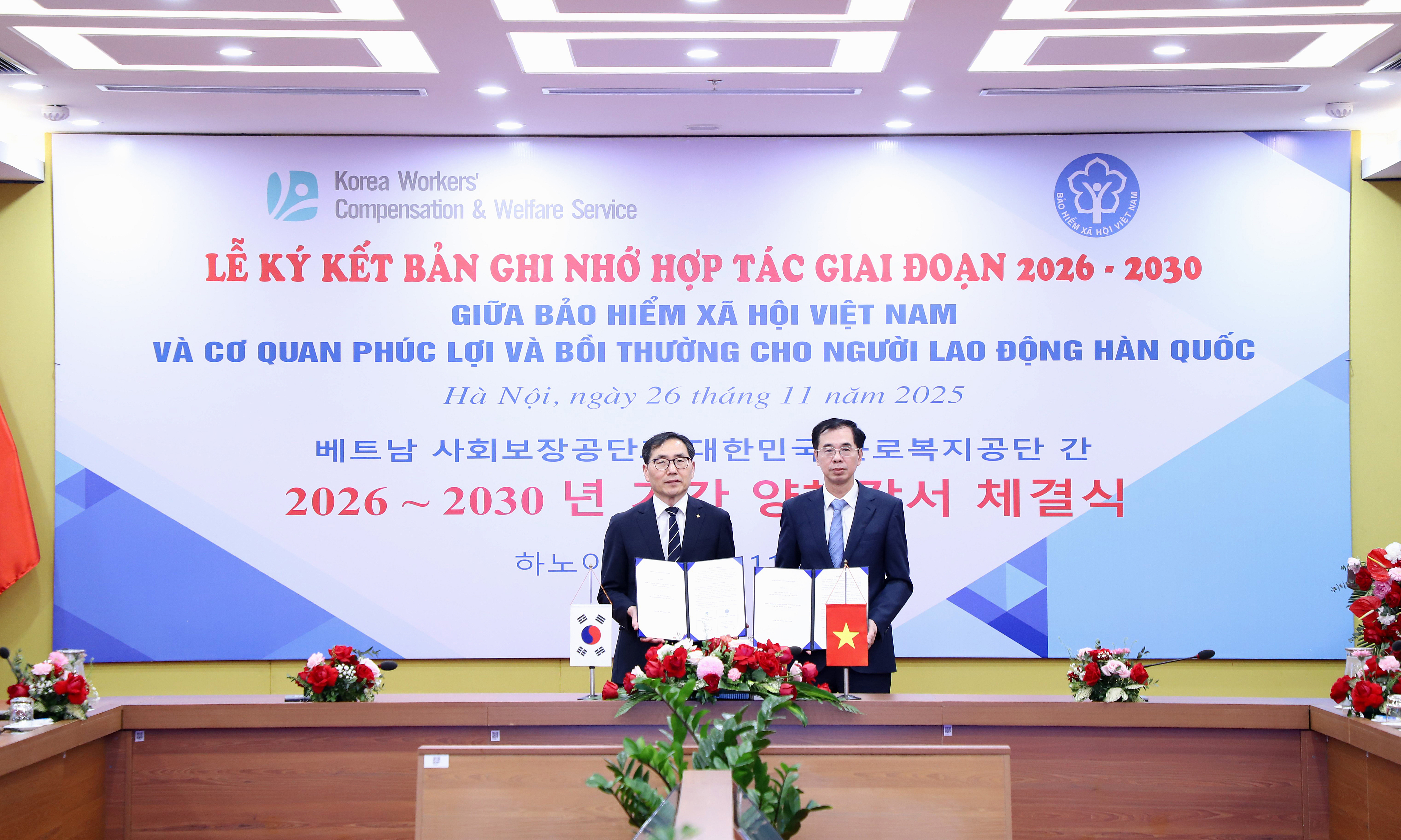 Ngày 26/11, tại Hà Nội, Bảo hiểm xã hội (BHXH) Việt Nam và Cơ quan Phúc lợi và Bồi thường cho người lao động Hàn Quốc (KCOMWEL) đã ký kết Biên bản ghi nhớ hợp tác (MOU) giai đoạn 2026-2030. Sự kiện đánh dấu bước phát triển mới trong quan hệ hợp tác giữa hai cơ quan, mở ra giai đoạn tăng cường phối hợp, chia sẻ kinh nghiệm và hoàn thiện hơn nữa các hoạt động hỗ trợ an sinh xã hội theo hướng hiệu quả và bền vững